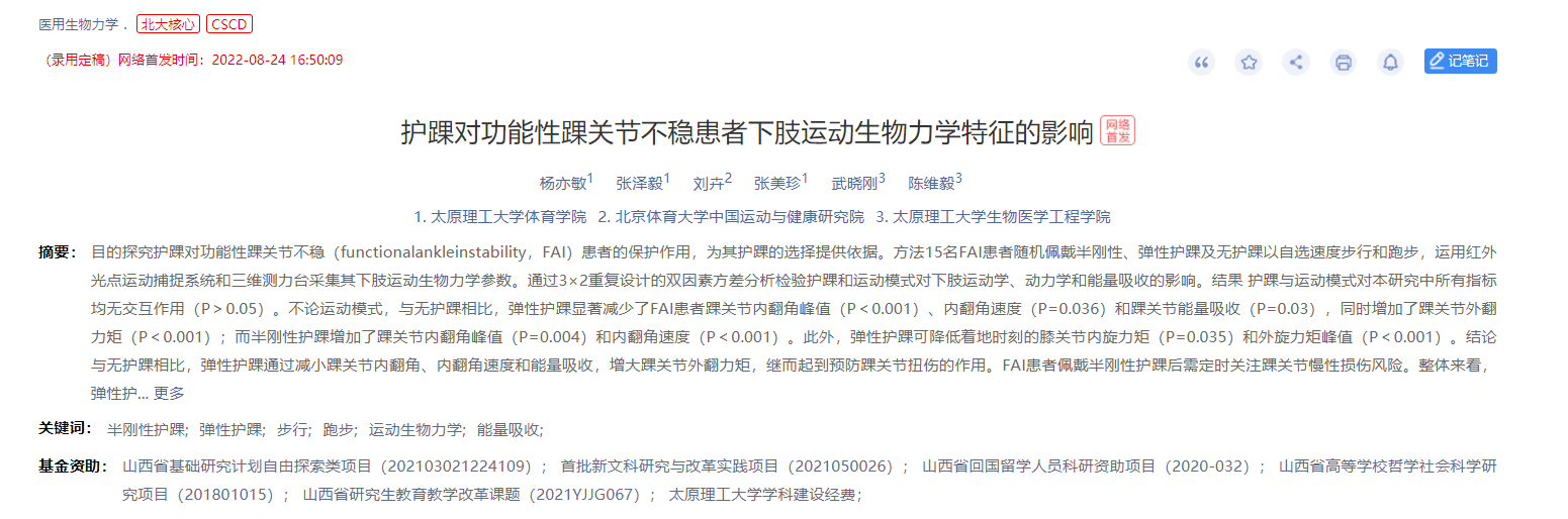 我院张美珍教授指导的硕士研究生杨亦敏的研究成果《护踝对功能性踝关节不稳患者下肢运动生物力学特征的影响》在《医用生物力学》上网络首发。《医用生物力学》杂志由上海交通大学主办,中华人民共和国教育部主管,上海交通大学医学院附属第九人民医院承办,是国内唯一一本公开发行,以积极反映生物力学基础研究与应用研究成果,目前是双核心期刊(北京大学中文核心期刊以及科技部科技核心期刊),并被全球最大的文献摘要与科研信息引用数据库Scopus收录。该论文是我院硕士研究生杨亦敏(第一作者)在导师张美珍教授(通讯作者)的指导下,与太原理工大学陈维毅教授团队、北京体育大学刘卉教授团队的合作成果,太原理工大学体育学院为第一署名单位。
