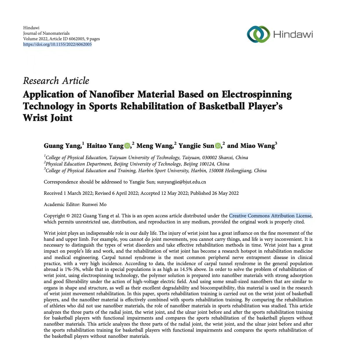 我院教师杨光的研究成果《Application of Nanofiber Material Based on Electrospinning Technology in Sports Rehabilitation of Basketball Player's Wrist Joint》(基于电纺丝技术的纳米纤维材料在运动员腕关节运动康复中的应用)在《Journal of Nanomaterials》(2022年第10期)发表。《Journal of Nanomaterials》由Professor Michael Z. Hu于2005年创立,在中科院分区中,《Journal of Nanomaterials》处于材料科学大类4区;在最近的出炉的JCR分区中,《Journal of Nanomaterials》在材料综合学科(189/335)和纳米科学与纳米技术(72/107)中均处于Q3。该论文是杨光老师(第一作者)与北京工业大学杨海涛副教授、王猛教授、孙洋杰讲师(通讯作者)以及哈尔滨体育学院王淼讲师的合作研究成果,太原理工大学体育学院为第一署名单位。