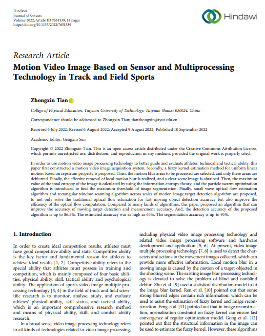 我院教师田忠新副教授的研究成果《Motion Video Image Based on Sensor and Multiprocessing Technology in Track and Field Sports》在《Journal of Sensors》上发表。《Journal of Sensors》中科院分区(工程技术)4区,JCR影响因子为2.336。该论文作者是田忠新副教授,太原理工大学体育学院为第一署名单位。