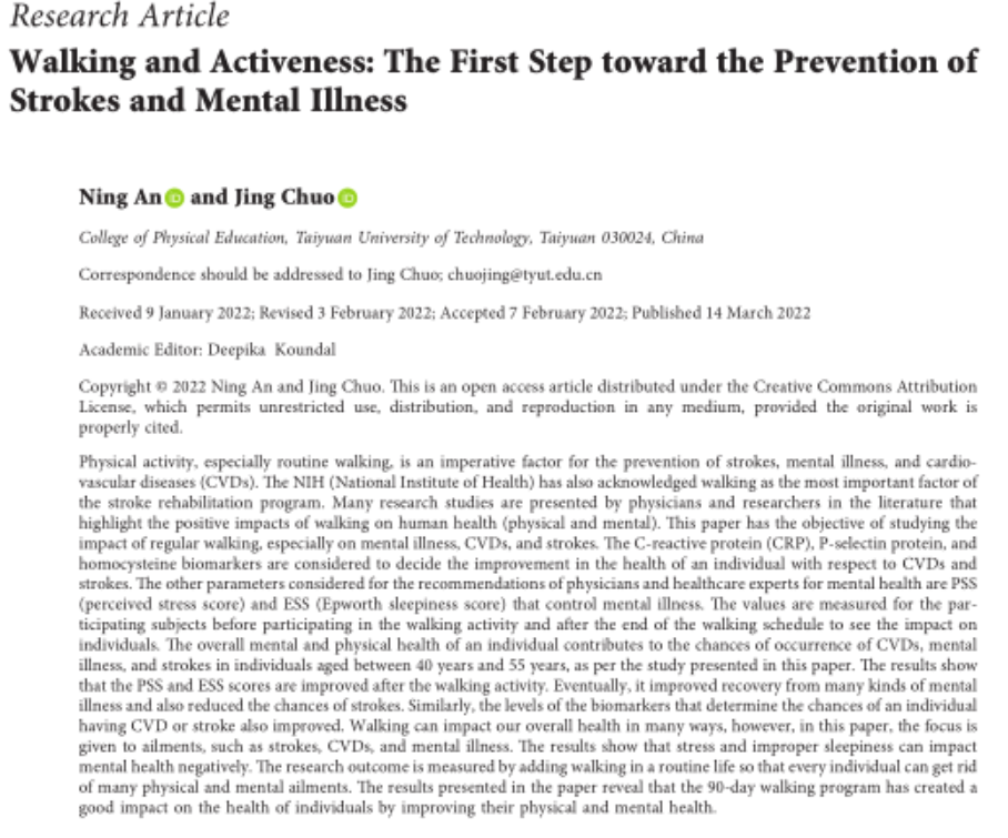 我院教师安宁、啜静研究成果《Walking and Activeness: The First Step toward the Prevention of Strokes and Mental Illness》在《Computational Intelligence and Neuroscience》(2022年3月)发表。该刊致力于发表经过严格同行评审的高质量原创文章,反映计算智能和神经科学与跨学科融合领域的新进展、新技术、新成果,促进学科交叉与融合领域科研交流和科研成果转化,中科院分区四区,JCR影响因子3.633(2020)。该论文是安宁(第一作者)与啜静(通讯作者)以及山西医科大学第一医院老年病科的合作成果,太原理工大学体育学院为第一署名单位。
