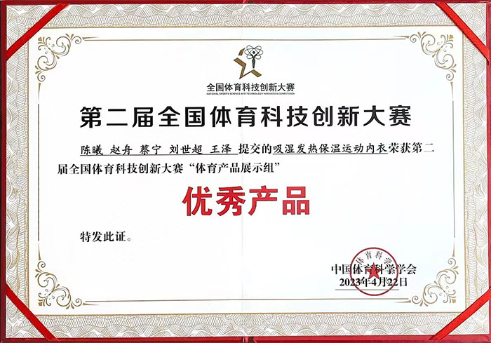 我院教师陈曦副教授的研究成果“吸湿发热保温运动内衣”和“青少年体育在线指导”在第二届全国体育科技创新大赛中荣获“优秀产品”奖项。