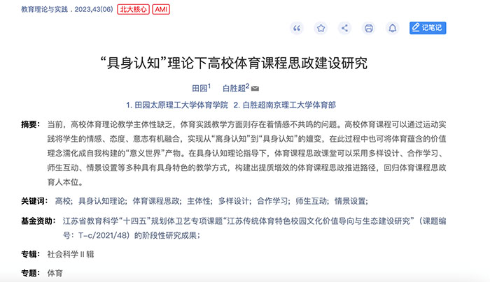 我院教师田园讲师的研究成果《“具身认知”理论下高校体育课程思政建设研究》在《教育理论与实践》(2023年第6期)发表。《教育理论与实践》是由山西省教育厅主管,山西教育科学研究院、山西省教育学会主办的综合性教育类学术期刊,该杂志是北京大学《中文核心期刊要目总览》来源期刊(2017年版),被中国知网、万方数据知识服务平台等数据库收录,被评为Cai-cd规范获奖期刊。该论文是我院田园老师(第一作者)与南京理工大学体育部白胜超老师的合作完成的科研成果,太原理工大学体育学院为第一署名单位。