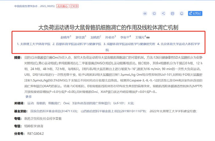 我院教师赵晓琴副教授的研究成果《大负荷运动诱导大鼠骨骼肌细胞凋亡的作用及线粒体凋亡机制》在《中国应用生理学杂志》(2022年第5期)发表。《中国应用生理学杂志》是中国生理学会、军事医学科学院和卫生学环境医学研究所主办的学术期刊,于1985年经新闻总署批准的正规刊物,被评定为“中国科技核心期刊、CSCD中国科学引文数据库来源期刊、北京大学《中文核心期刊要目总览》来源期刊,同时被国内外多个科技期刊检索系统或数据库收录。该论文是赵晓琴副教授(第一作者)与北京体育大学王瑞元教授的合作成果,太原理工大学体育学院为第一署名单位。