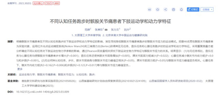 我院硕士研究生范婷的研究成果《不同认知任务跑步时髌股关节痛患者下肢运动学和动力学特征》在《体育学刊》(2023年第3期)发表。《体育学刊》是中华人民共和国教育部主管,华南理工大学和华南师范大学联合主办的体育学术刊物,2000年入选全国中文体育核心期刊,2002年被评为全国高校人文社科优秀学报,2006年获首届中国高校优秀科技期刊。《体育学刊》是中文社会科学引文索引(CSSCI)、北京大学《中文核心期刊要目总览》来源期刊、JST 日本科学技术振兴机构数据库(2022)等国内外多个知名检索期刊和数据库的刊源,是国内同类刊物中权威杂志。该论文是我院硕士研究生范婷(第一作者)在导师张美珍教授(通讯作者)的指导下,与北京体育大学刘卉教授团队的合作成果,太原理工大学体育学院为第一署名单位。