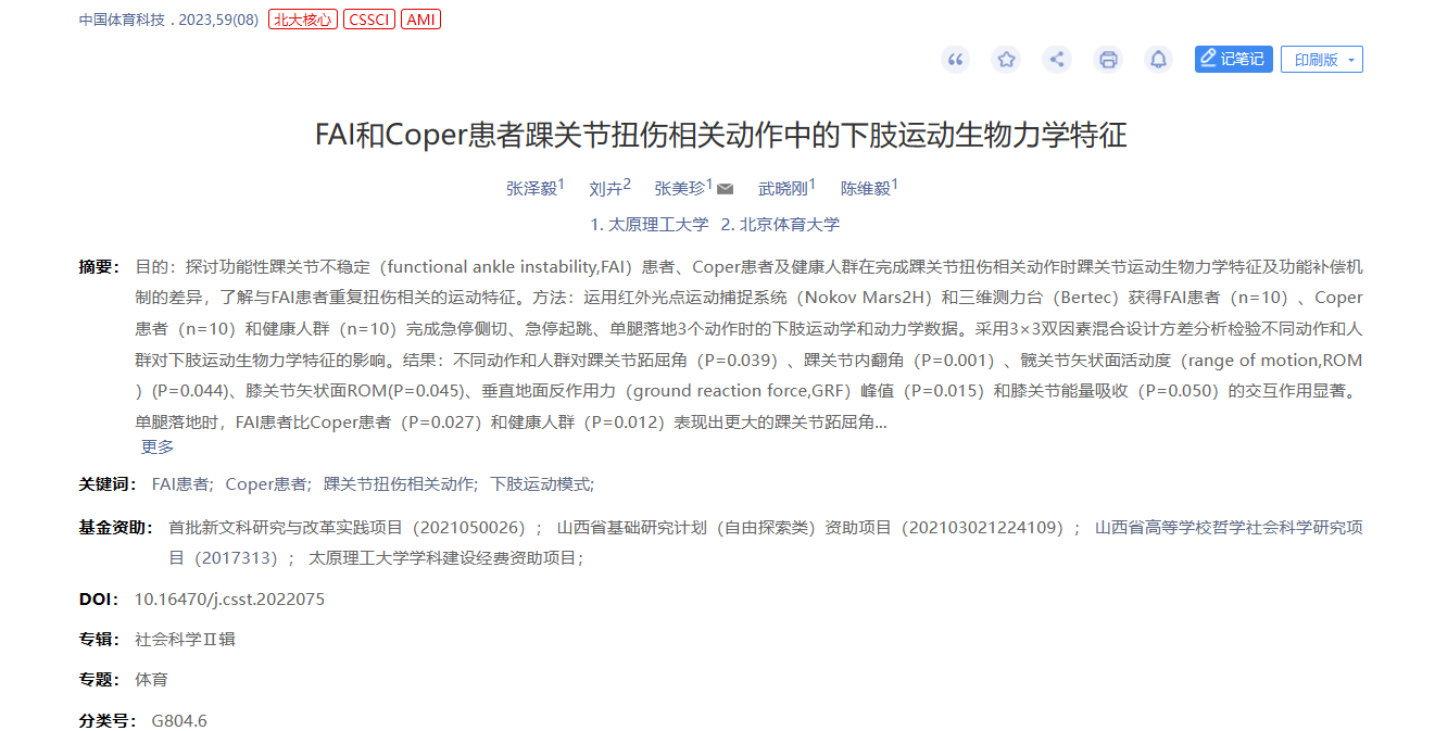 我院硕士研究生张泽毅的研究成果《FAI和Coper患者踝关节扭伤相关动作中的下肢运动生物力学特征》在《中国体育科技》发表。《中国体育科技》是国家体育总局体育科学研究所主办,在近十多年来的中文类体育学术期刊的评价中,影响因子始终保持前列。多年来一直是中文体育类核心期刊、中国人文社会科学核心期刊、CSSCI来源期刊,中国社科院期刊评价报告评为核心期刊。该论文是我院硕士研究生张泽毅(第一作者)在导师张美珍教授(通讯作者)的指导下,与北京体育大学刘卉教授、太原理工大学陈维毅教授等的合作成果,太原理工大学体育学院为第一署名单位。