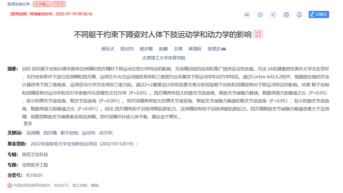 我院本科生郝乐天的研究成果《不同躯干约束下蹲姿对人体下肢运动学和动力学的影响》在《医用生物力学》(网络首发)发表。《医用生物力学》杂志由上海交通大学主办,中华人民共和国教育部主管,上海交通大学医学院附属第九人民医院承办,是国内唯一一本公开发行,以积极反映生物力学基础研究与应用研究成果,推动国内外学术交流,促进医、理、工各学科相互了解和合作为目的学术性刊物。目前,本刊是双核心期刊(北京大学中文核心期刊以及科技部科技核心期刊),并被全球最大的文献摘要与科研信息引用数据库Scopus收录。该论文是我院本科生郝乐天(第一作者)在导师张美珍教授(通讯作者)指导下的研究成果,太原理工大学体育学院为第一署名单位。该成果依托国家级大学生创新创业项目:不同姿势控制对亚洲蹲和西方蹲下肢运动生物力学特征的影响。