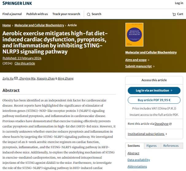 我院教师徐祖杰副教授的研究成果《Aerobic exercise mitigates high-fat diet-induced cardiac dysfunction, pyroptosis, and inflammation by inhibiting STING-NLRP3 signaling pathway》在《Molecular and Cellular Biochemistry》在线发表。《Molecular and Cellular Biochemistry》主要发表生物医学领域原创研究论文、简短通讯和最新评论,强调与人类疾病的分子和细胞基础有关的新发现。该期刊被SCIE(Science Citation Index Expanded)收录,被评定为“JCR-Q2,中科院2区”期刊。该论文是徐祖杰副教授(第一作者、通讯作者)与马哲莹、赵晓琴副教授以及清华大学张冰教授的合作成果,太原理工大学体育学院为第一署名单位。