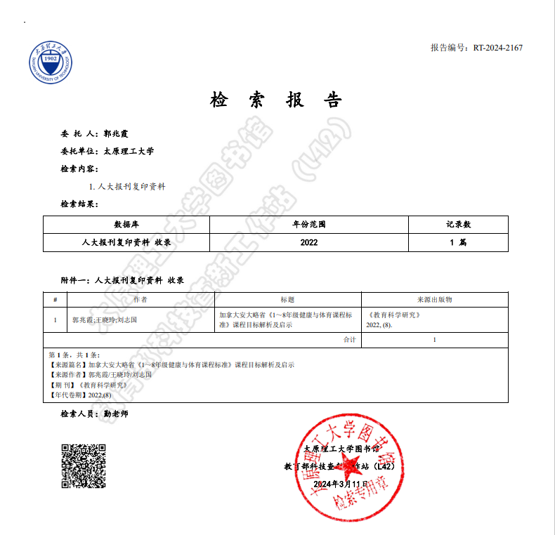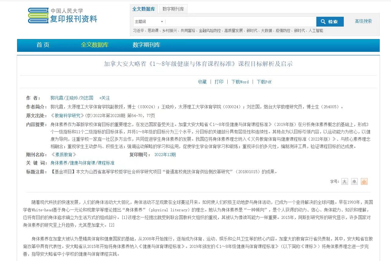 郭兆霞副教授团队于2022年在《教育科学研究》发表的论文《加拿大安大略省《1~8年级健康与体育课程标准》课程目标解析及启示》被人大报刊复印资料全文收录。太原理工大学体育学院为第一署名单位。这是我院首次科研成果被人大报刊复印资料全文收录,这既是对郭兆霞副教授学术成果的肯定,亦是对我院学科建设的重要支撑。