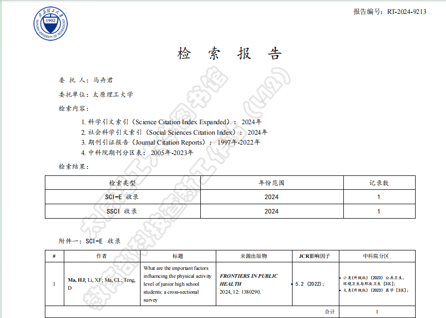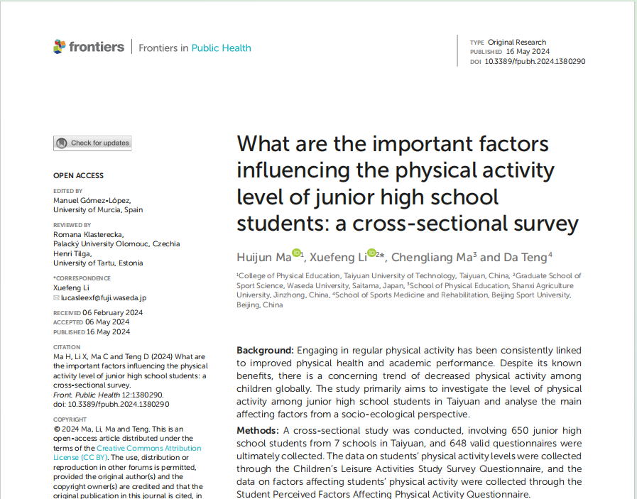 我院教师马卉君的研究成果《What are the important factors influencing the physical activity level of junior high school students: a cross-sectional survey》在《Frontiers in Public Health》发表。《Frontiers in Public Health》涵盖公共卫生方向的不同研究领域,旨在向全球研究人员、学者、临床医生、政策制定者和公众传播和交流科学知识和有影响力的发现的最前沿。该期刊同时被SCIE(Science Citation Index Expanded)和SSCI(Social Science Citation Index)双数据库收录,被评定为“JCR-Q2,中科院3区”期刊。该论文是马卉君博士(第一作者)、日本早稻田大学李雪峰博士(通讯作者)、山西农业大学马成亮教授、北京体育大学滕达的合作成果,太原理工大学体育学院为第一署名单位。