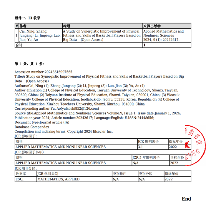 我院教师蔡宁老师的研究成果《A Study on Synergistic Improvement of Physical Fitness and Skills of Basketball Players Based on Big Data》在《Applied Mathematics and Nonlinear Science》发表。《Applied Mathematics and Nonlinear Science》是一本专注于发表用数学和非线性科学的方法来解决体育等领域原创研究的学术期刊。期刊接受基于分析、计算和实验方法的综述文章和原创贡献,致力于发表高质量的短论文、常规论文和阐释性论文,该期刊为EI期刊。该论文是我院教师蔡宁老师(第一作者)的研究成果,太原理工大学体育学院为第一署名单位。